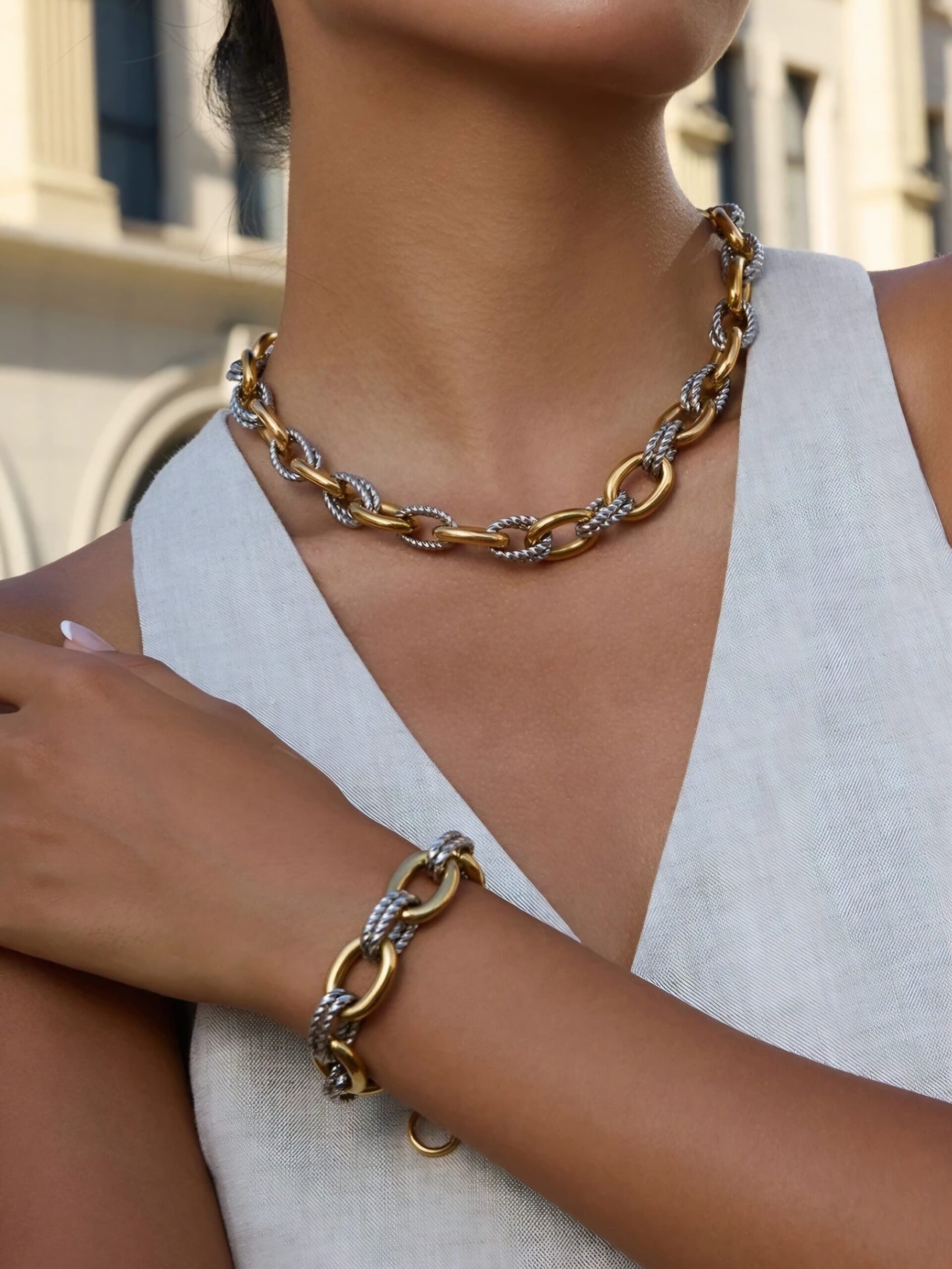 Statement ατσάλινο βραχιόλι σε δίχρωμο σχέδιο (χρυσό & ασημί). Ιδανικό για μοντέρνες, εντυπωσιακές εμφανίσεις. Φοριέται μόνο του για να ξεχωρίζει ή σε συνδυασμό με άλλα bold κοσμήματα για ακόμα πιο δυνατό αποτέλεσμα.