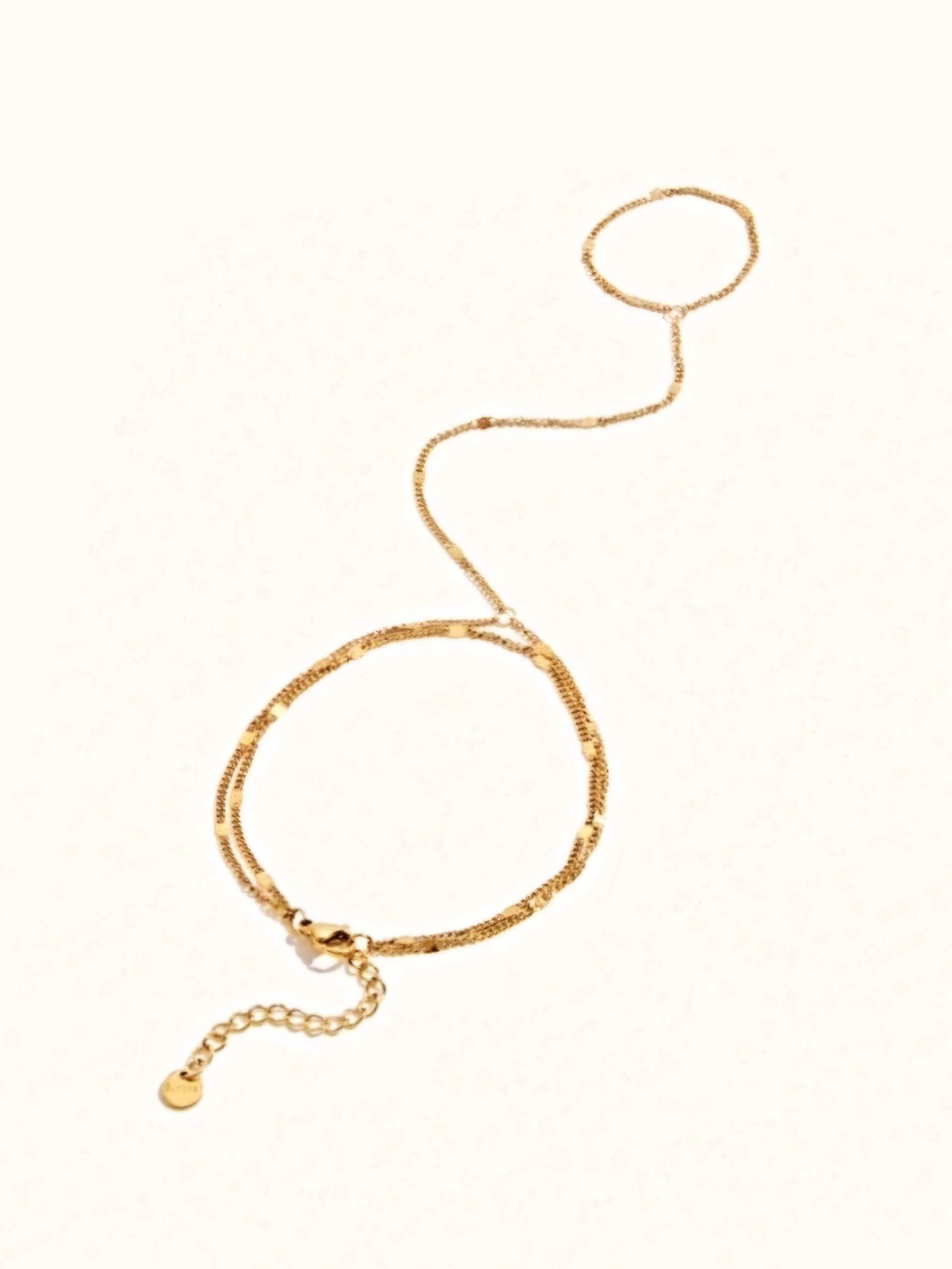 Ένα κομψό hand chain από ατσάλι που συνδέει τον καρπό με το δάχτυλο μέσα από απαλά μεταλλικά σχήματα. Θηλυκό, elegant και ιδανικό για day-to-night εμφανίσεις.