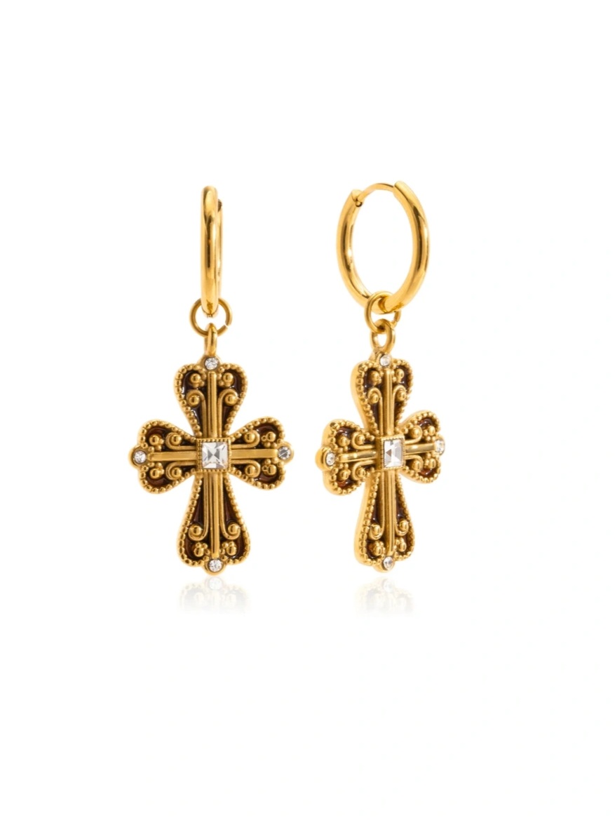 Εκλεπτυσμένα ατσάλινα σκουλαρίκια με σταυρό και λαμπερές λεπτομέρειες. Διαχρονικό σχέδιο που αποπνέει κομψότητα και διακριτική πολυτέλεια σε κάθε εμφάνιση.