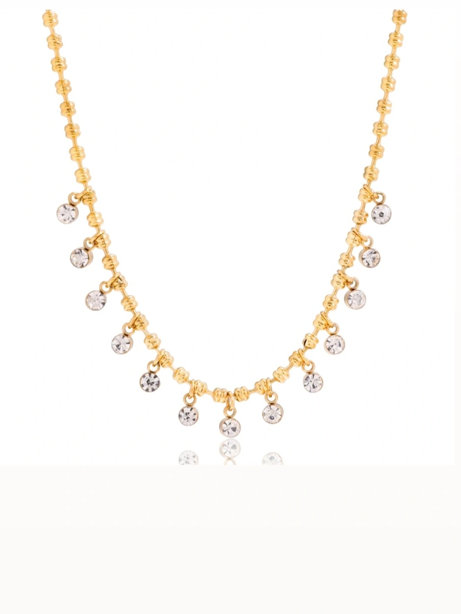 Κομψό κολιέ από ατσάλι με λαμπερά ζιργκόν που χαρίζουν διακριτική πολυτέλεια. Φόρεσε το μόνο του για μια elegant πινελιά ή συνδύασέ το με λεπτές αλυσίδες για μοντέρνο layering.