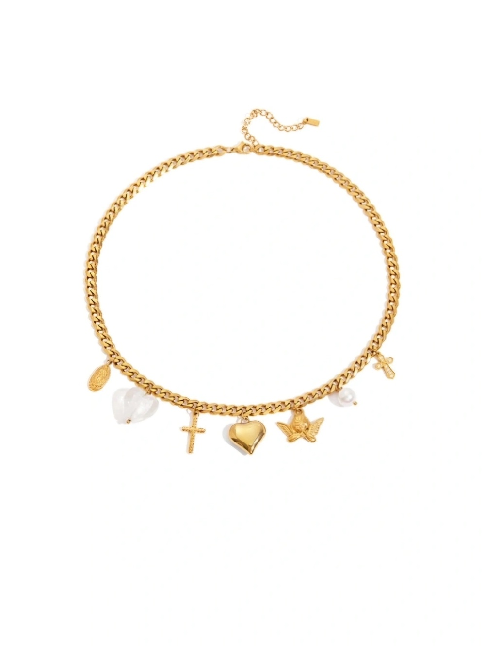 Εκλεπτυσμένο ατσάλινο κολιέ με χρυσή αλυσίδα και συμβολικά charms. Συνδυάζει διαχρονική κομψότητα με σύγχρονη αισθητική, προσθέτοντας διακριτική λάμψη και χαρακτήρα σε κάθε εμφάνιση.
