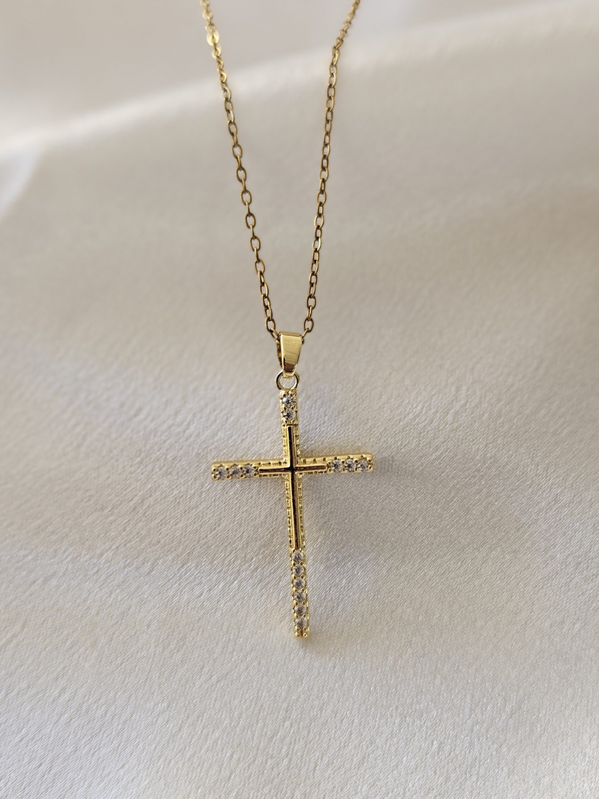 Κομψό και διακριτικό κολιέ από ανοξείδωτο ατσάλι σε χρυσό χρώμα, με εντυπωσιακό σταυρό διακοσμημένο με λαμπερά λευκά ζιργκόν.