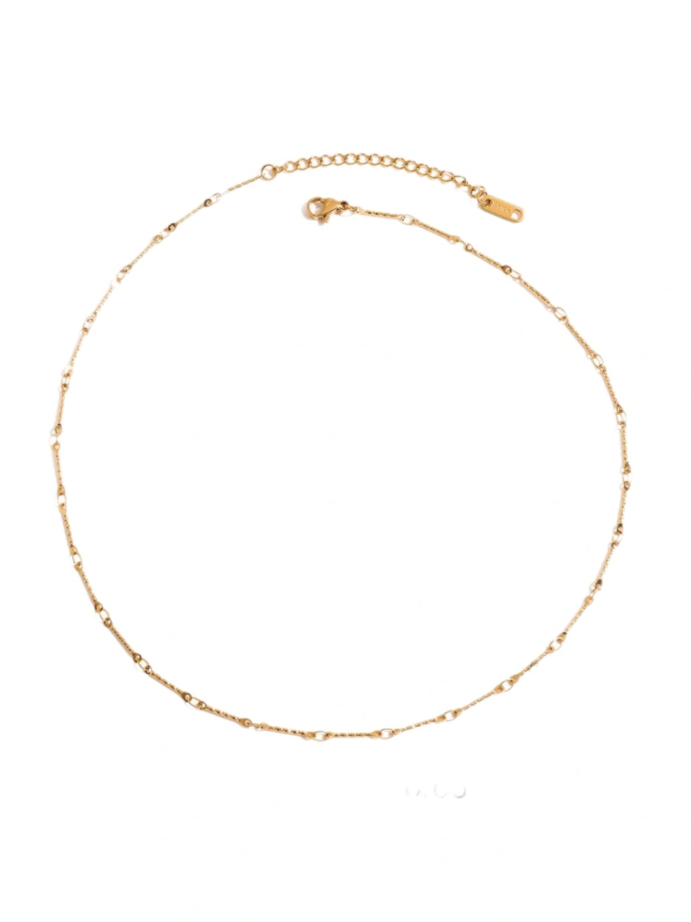 Απαλό, λεπτό χρυσό κολιέ με διακριτικά σχέδια στην αλυσίδα. Ιδανικό για καθημερινή χρήση ή layering με άλλα κολιέ, προσφέροντας ένα minimal και κομψό αποτέλεσμα.