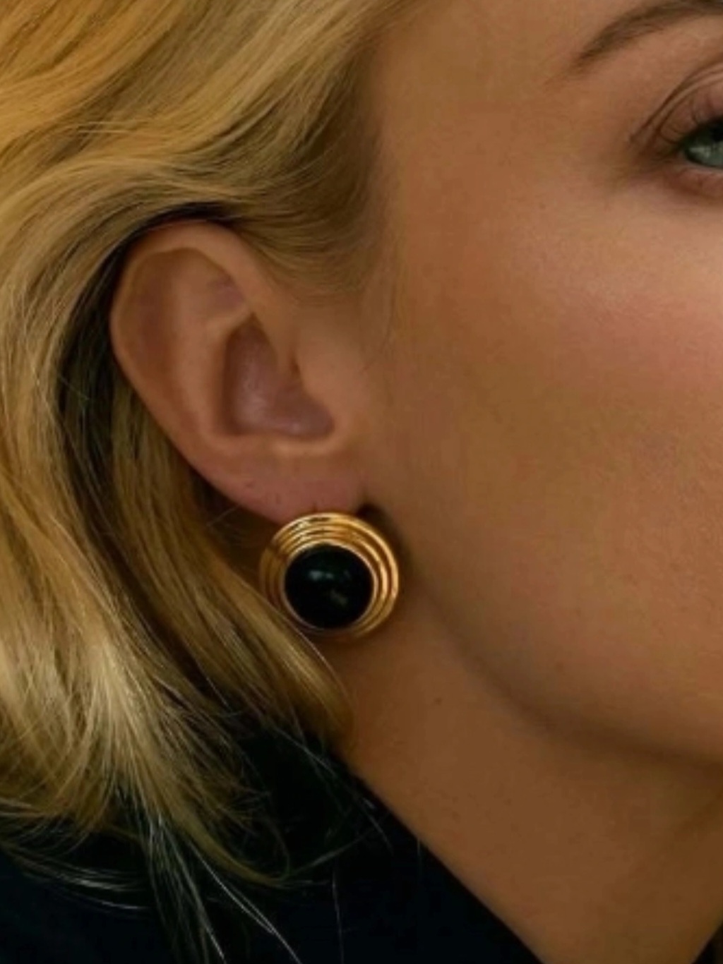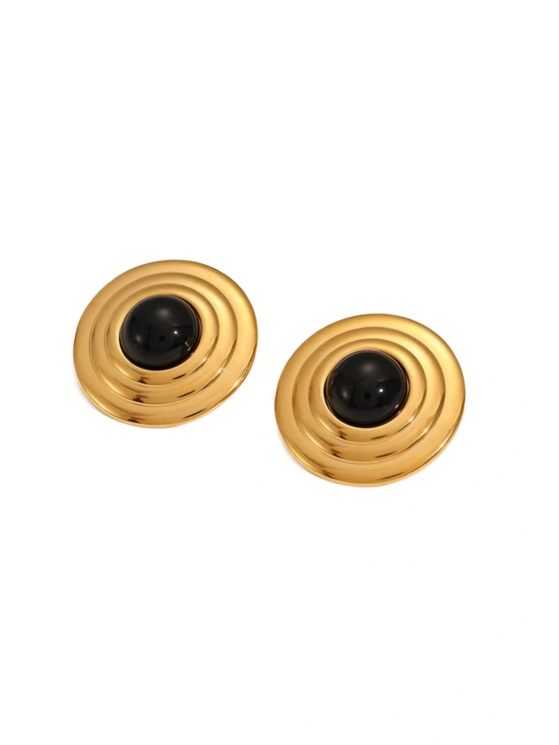 Σκουλαρίκια από ατσάλι με μαύρη πέτρα και χρυσό περίγραμμα. Ένα κομψό, διαχρονικό κόσμημα που συνδυάζει τη δύναμη του μαύρου με τη λάμψη του χρυσού — ιδανικό για κάθε στιγμή της ημέρας.