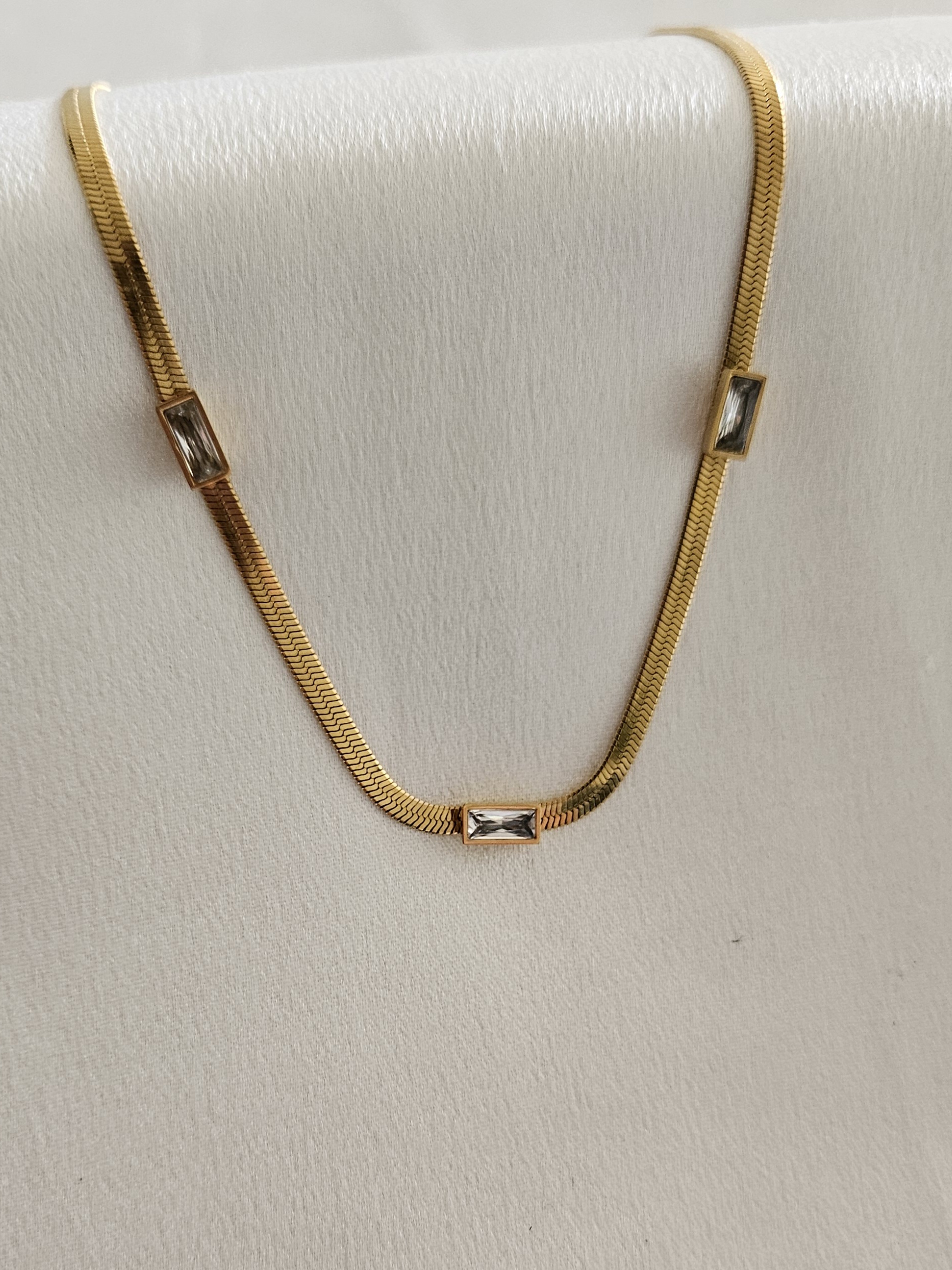 Ατσάλινο, κομψό κολιέ τύπου snake chain με λευκά ζιργκόν για διακριτική λάμψη.