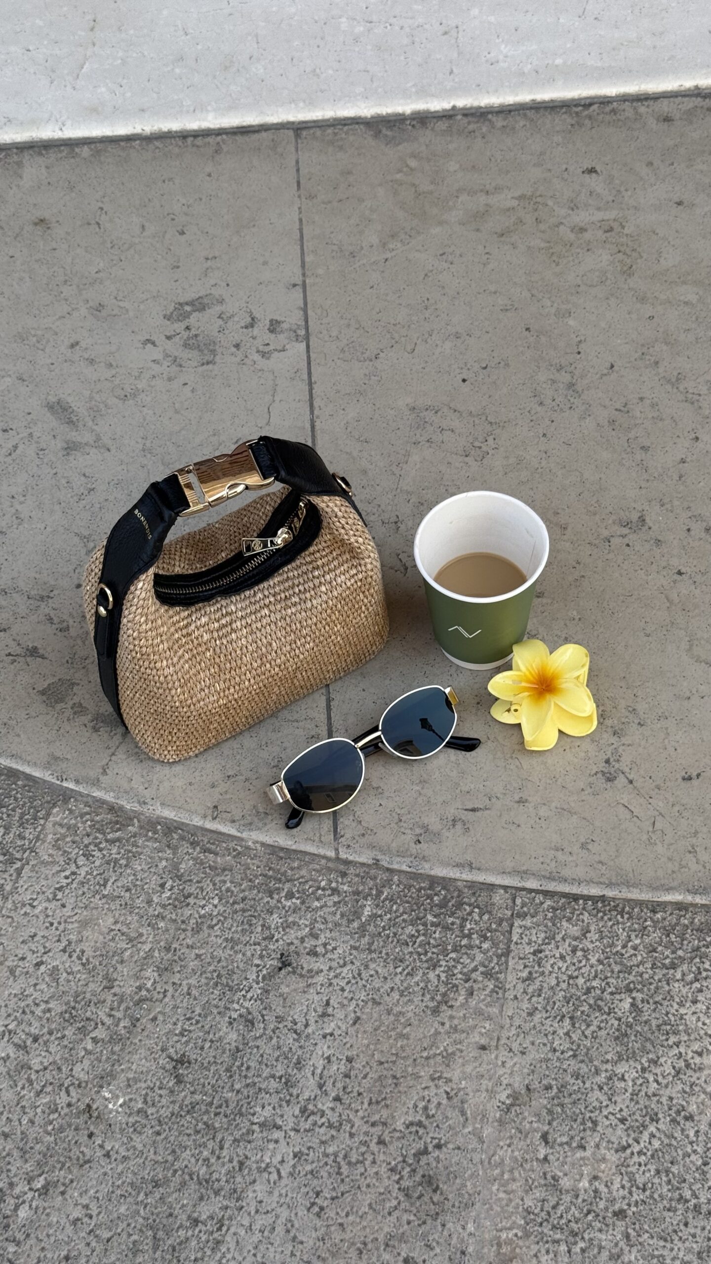 Is a true Raffia jewel. Petite, elegant, is decorated with beautiful details and a gold buckle that crowns this lovely leather soft handbag. It combined with a leather strap so it can be worn as cross body bag. A sleek and structured accessory designed to elevate your style with elegance and sophistication in any occasion .