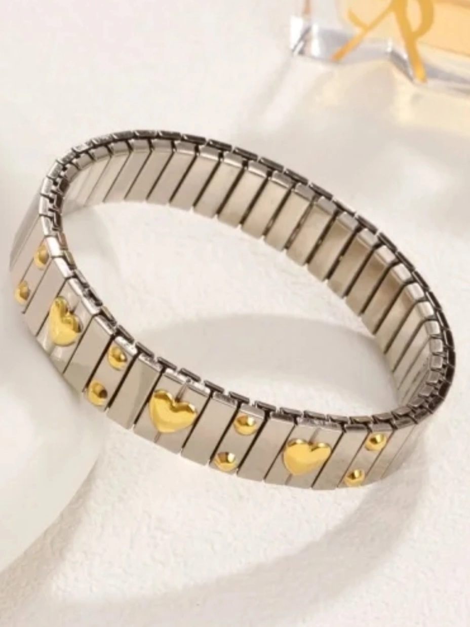 Ασημενιο ελαστικο βραχιόλι με χρυσες καρδιες από ατσάλι . Φοριέται μόνο του ή με άλλα για cool layered look.