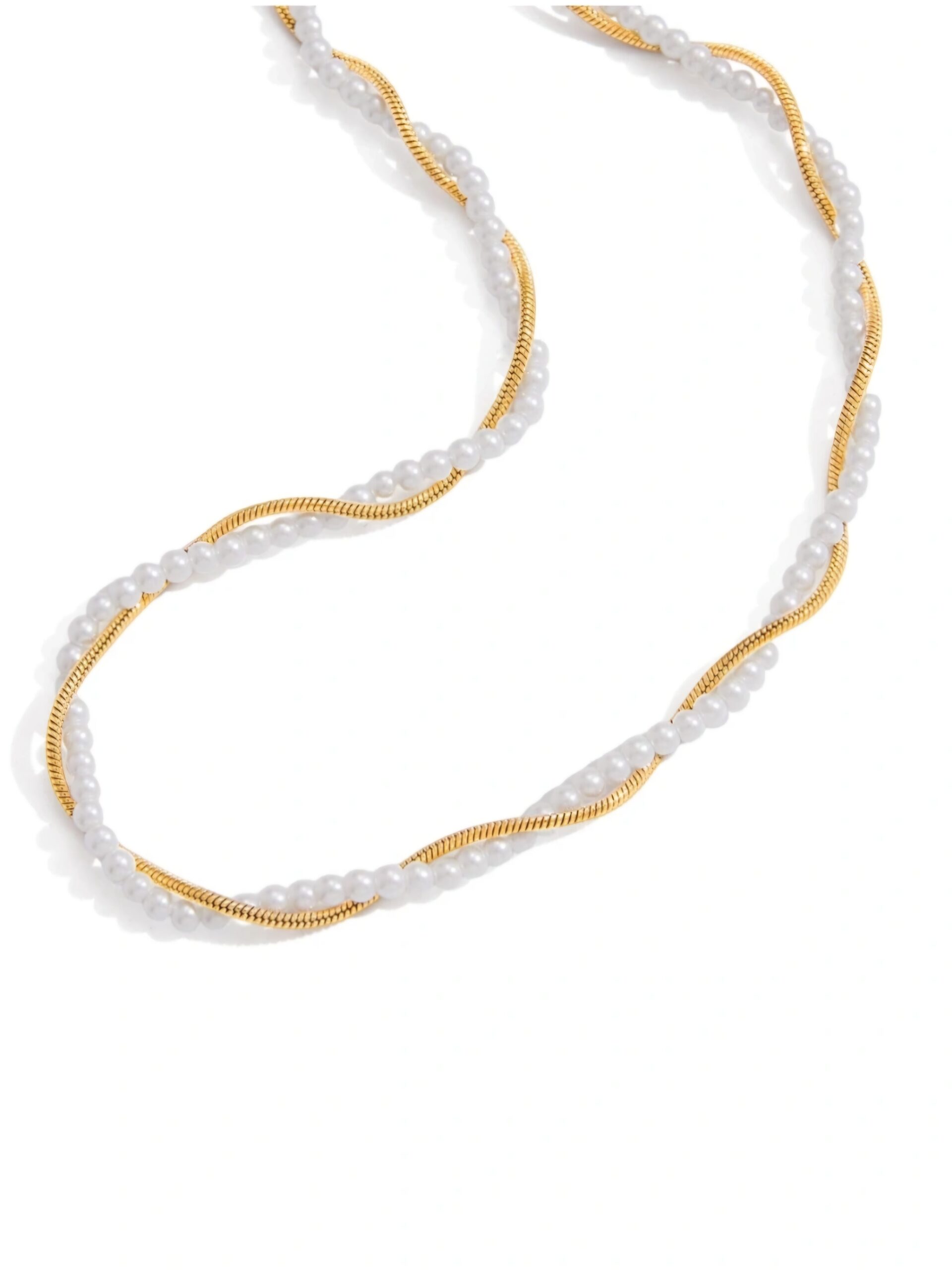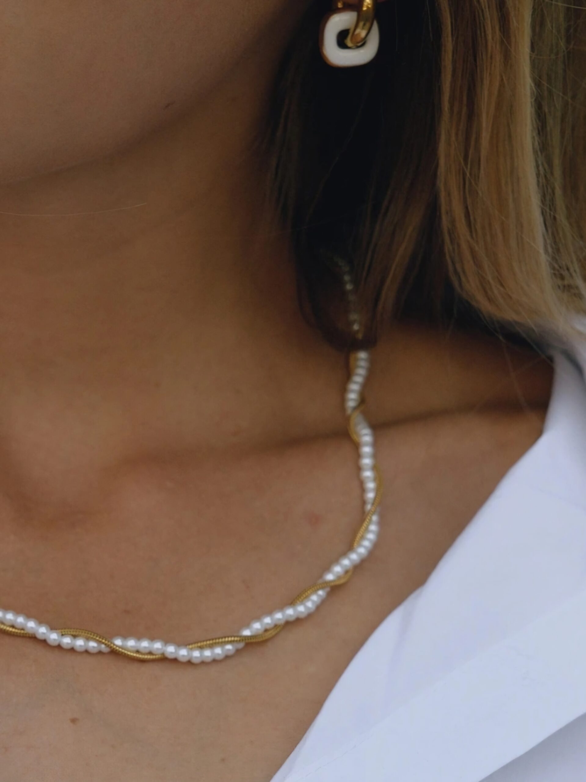 Κολιέ με πέρλες και πλεκτή (braided) χρυσή αλυσίδα. Elegant και ιδιαίτερο κομμάτι που συνδυάζει κλασική κομψότητα με μοντέρνο σχέδιο. Φόρεσέ το μόνο του ή σε layering για ξεχωριστό look.