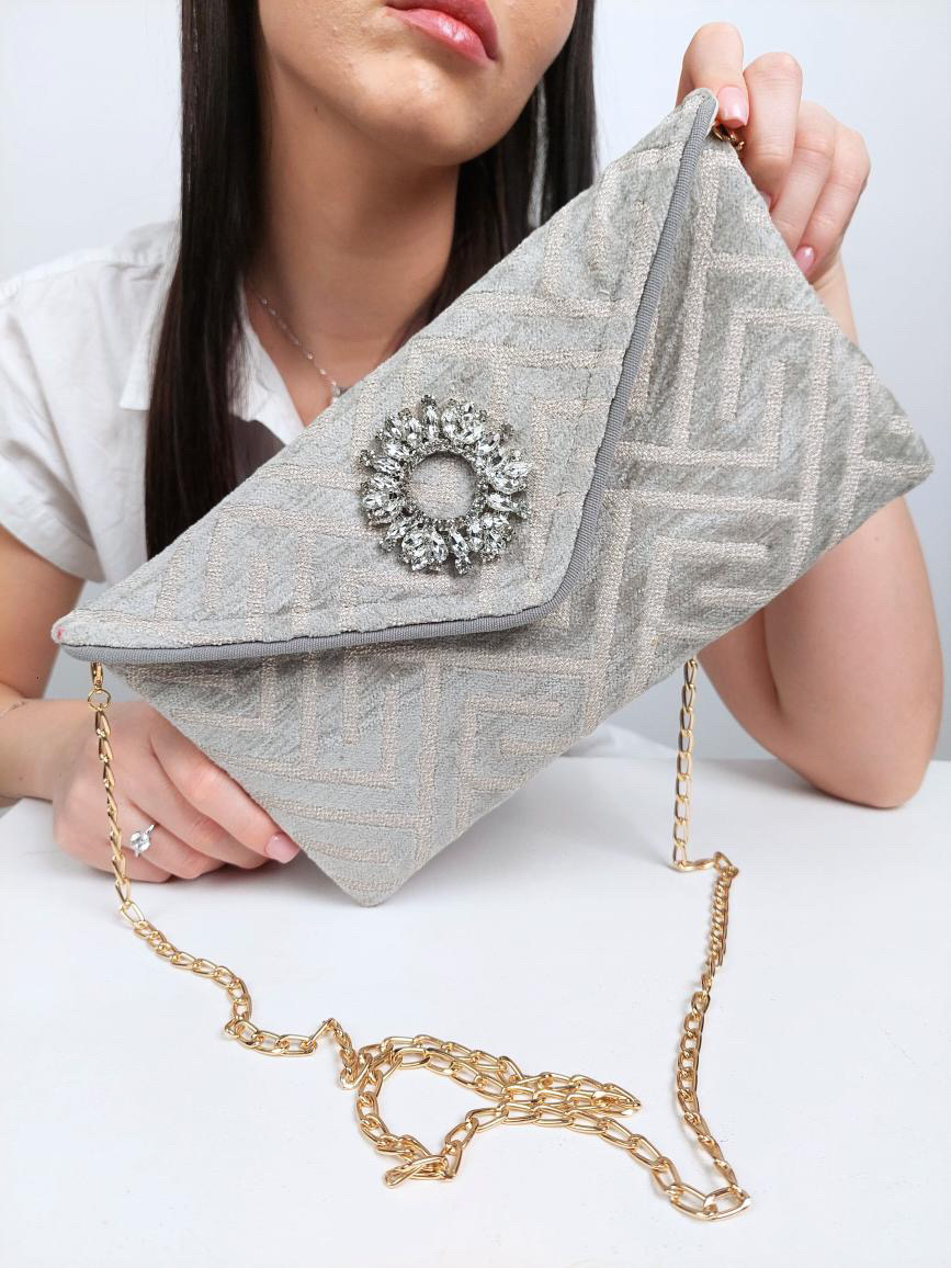Statement clutch με μεταλλικη αλυσιδα για ανετη χρηση και στον ωμο. Ιδανικη για βραδινες εμφανισεις η boho – chic looks. Ενα κομματι που αποπνεει στυλ και προσωπικοτητα.